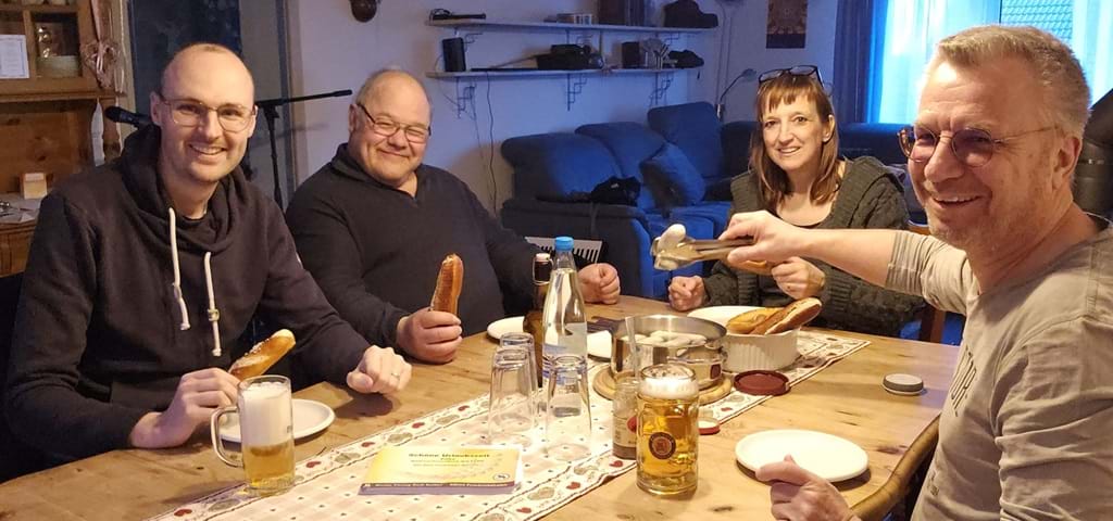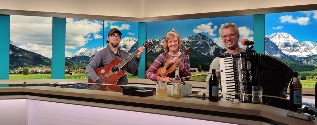Eifriges Proben im Fernsehstudio. Natürlich wollen auch wir weitermusizieren und proben. Schließlich wollen wir mit Abstand die Besten werden. Dazu haben wir uns im Fernsehstudio verabredet. Mit dem passenden alpenländischen Hintergrund und einem Bierchen machte das Musizieren besonders Spaß. Zum Glück war am Wochenende keine Sendung...Zünftige Musik im Biergarten