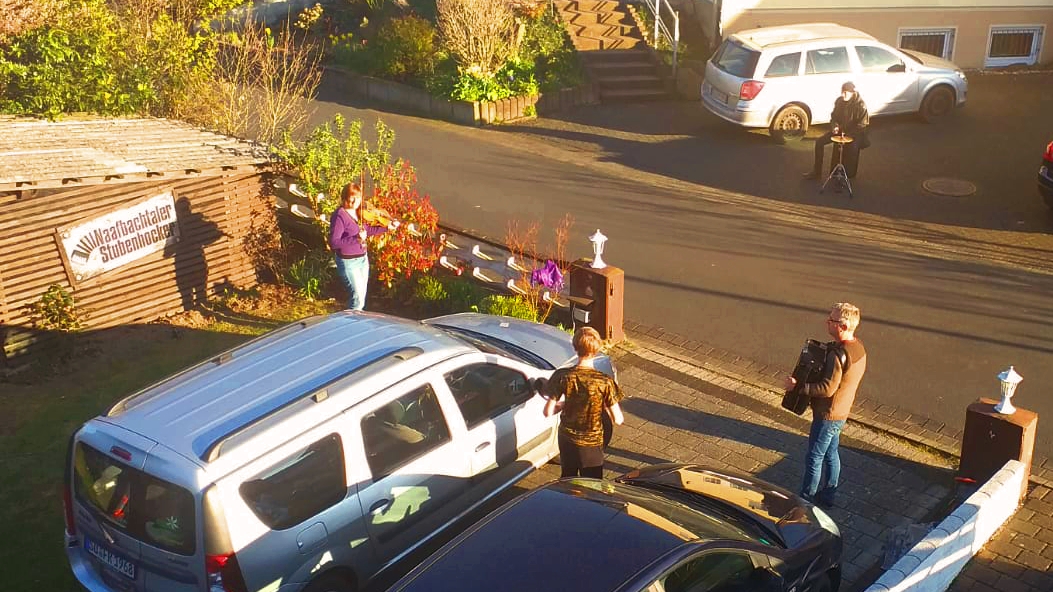 Trotz Corona haben wir natürlich musiziert. Mit Abstand haben wir den ein oder anderen Nachmittag unserer Biergartenterasse und der Straße Musik gemacht. Die Nachbarn waren fasziniert und spendierten das ein oder andere Stamperl.