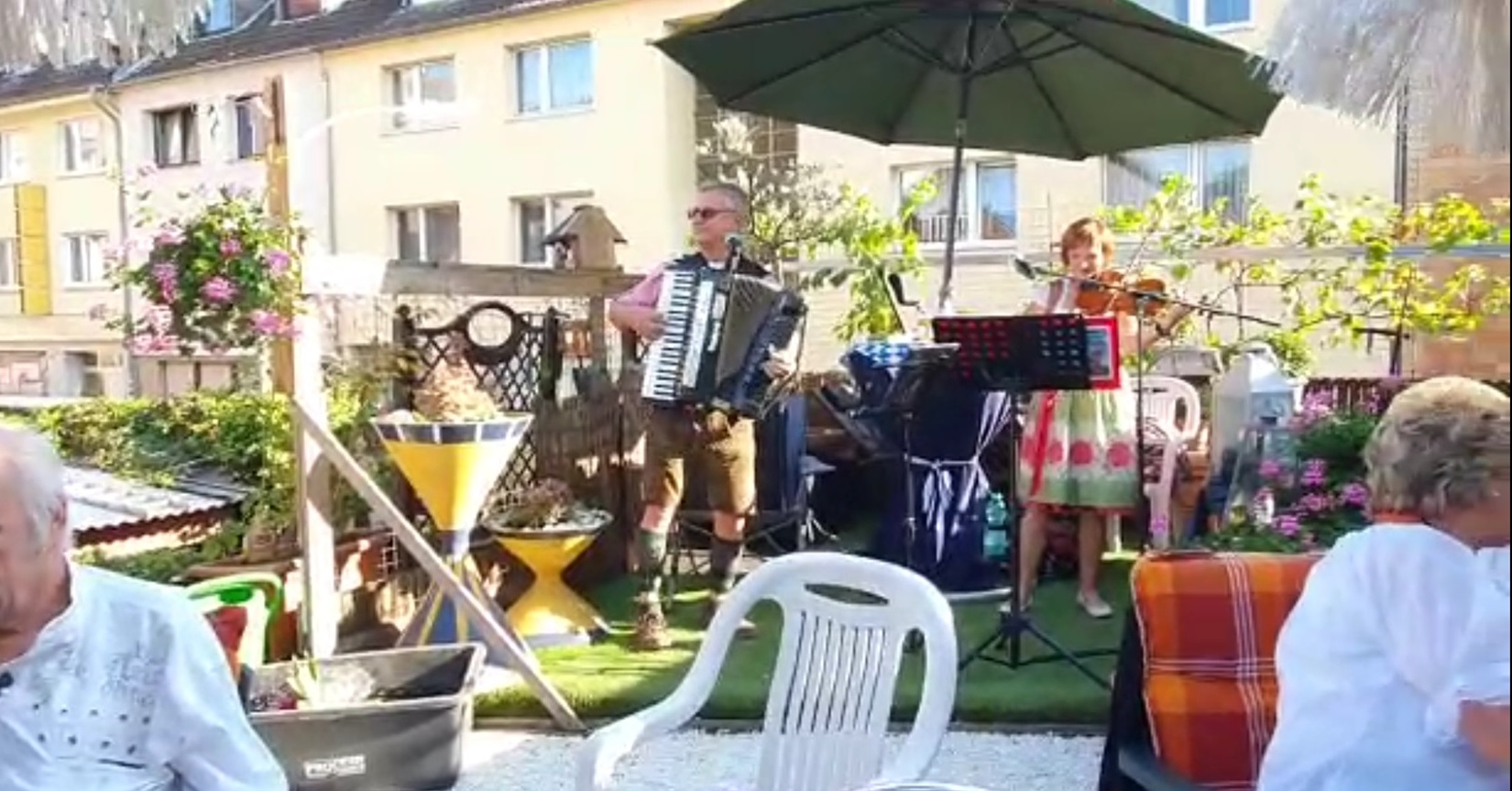 In einem faszinierenden Ambiente, über den Dächern von Köln, im Dach-Biergarten von Josef Weber waren wir als Überraschungsband gebucht. Coronabedingt nur zu zweit. Mit zünftigem "Auf der Autobahn" gings los.Für eine gute Stunde unterhielten wir die Urkölner mit unseren bayerischen und kölschen Titeln. Ein wundervoller Nachmittag zu verdanken dem edlen "Spender" Hein Keul.
